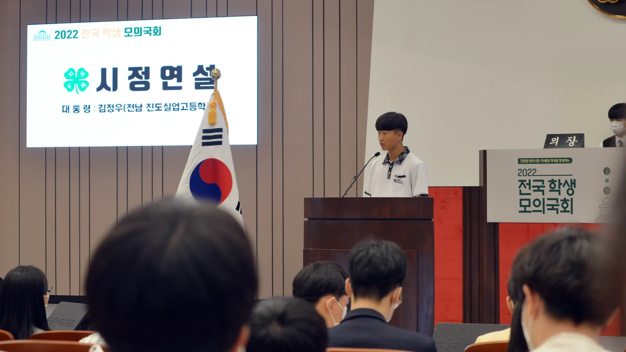 저는 우리나라 행정부의 수반인 모의대통령 전남 진도 실업고등학교 김정우입니다. 오늘 2022년 전국 학생 모의국회 본회의를 맞이하여 내년도 국정운영 방향에 대해 말씀드리게 된 것을 매우 뜻 깊게 생각합니다.